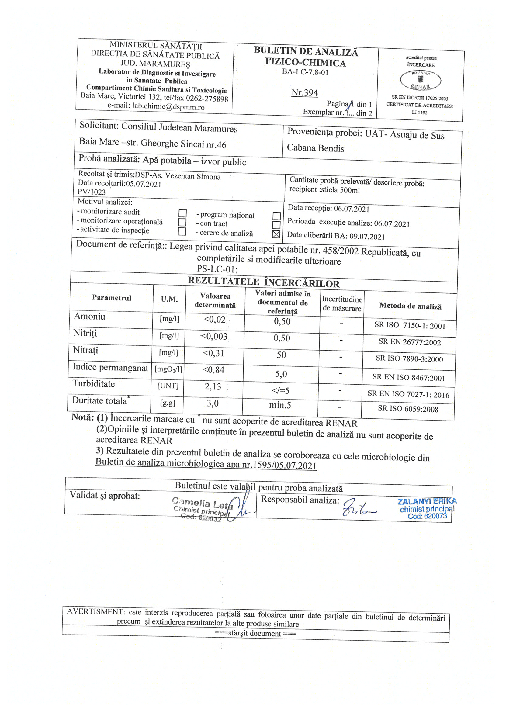 20 | Izvor Cabana Bendiș | Asuaju de Sus | Se identifică cauzele de neconformitate, se remediază și se repetă analizele | ||