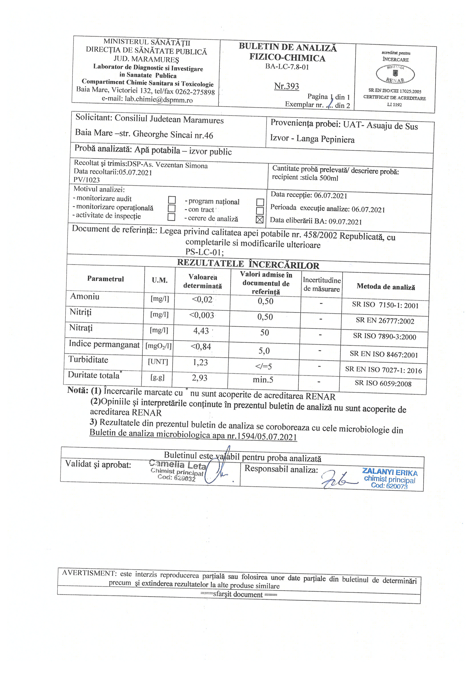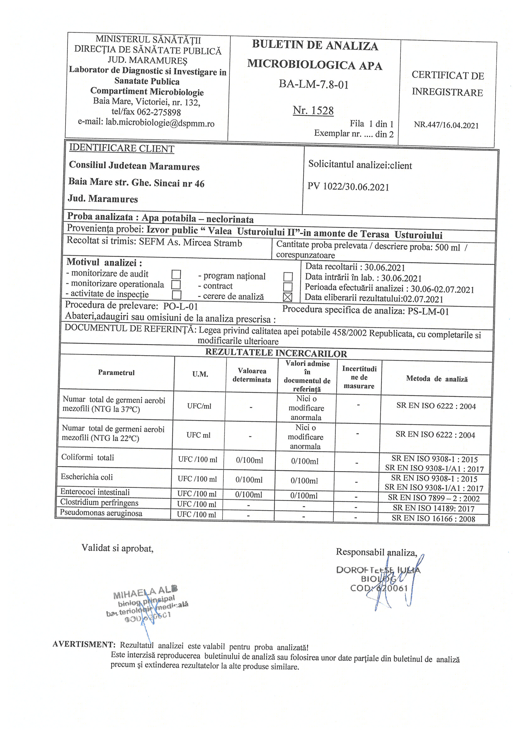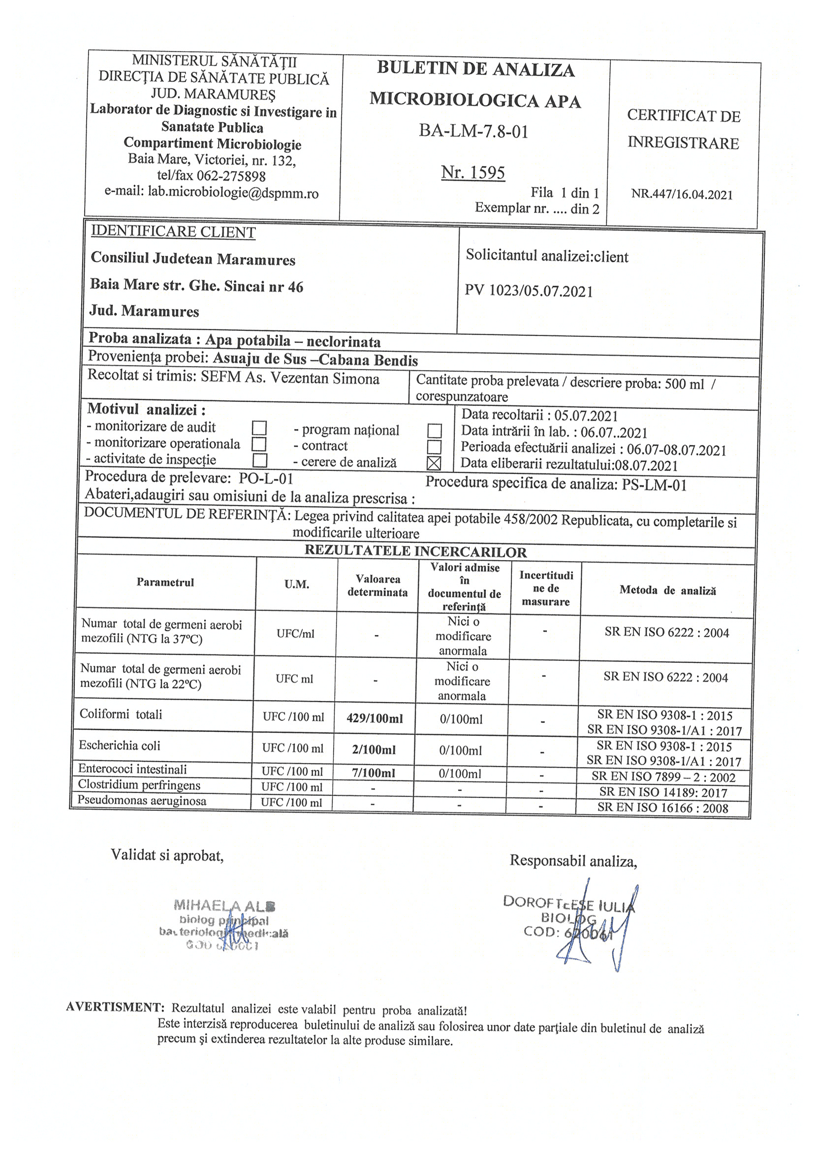 21 | Izvor Dosul Mare | Asuaju de Sus | Se identifică cauzele de neconformitate, se remediază și se repetă analizele | ||