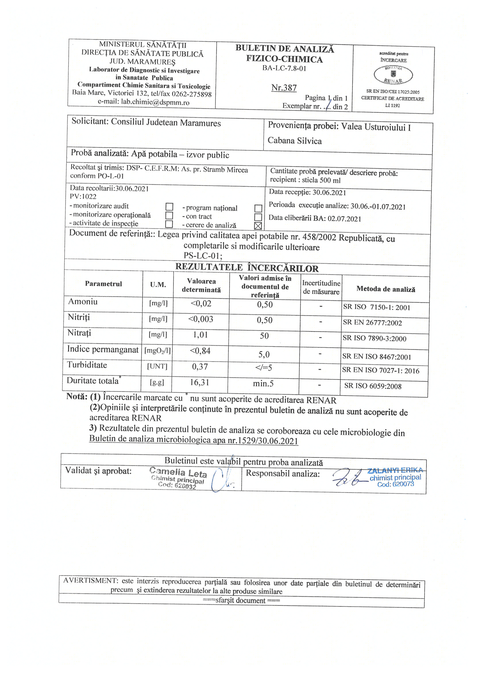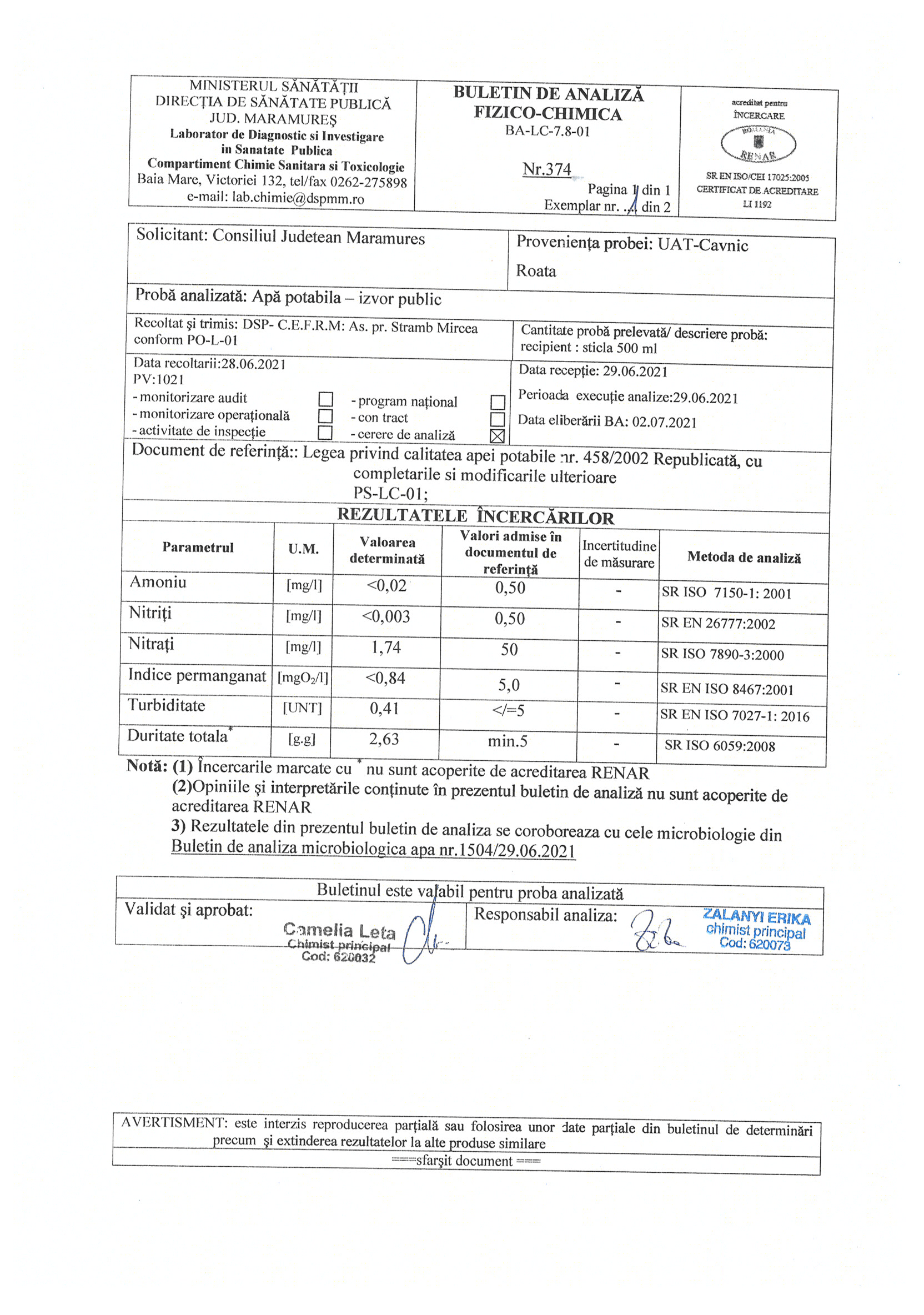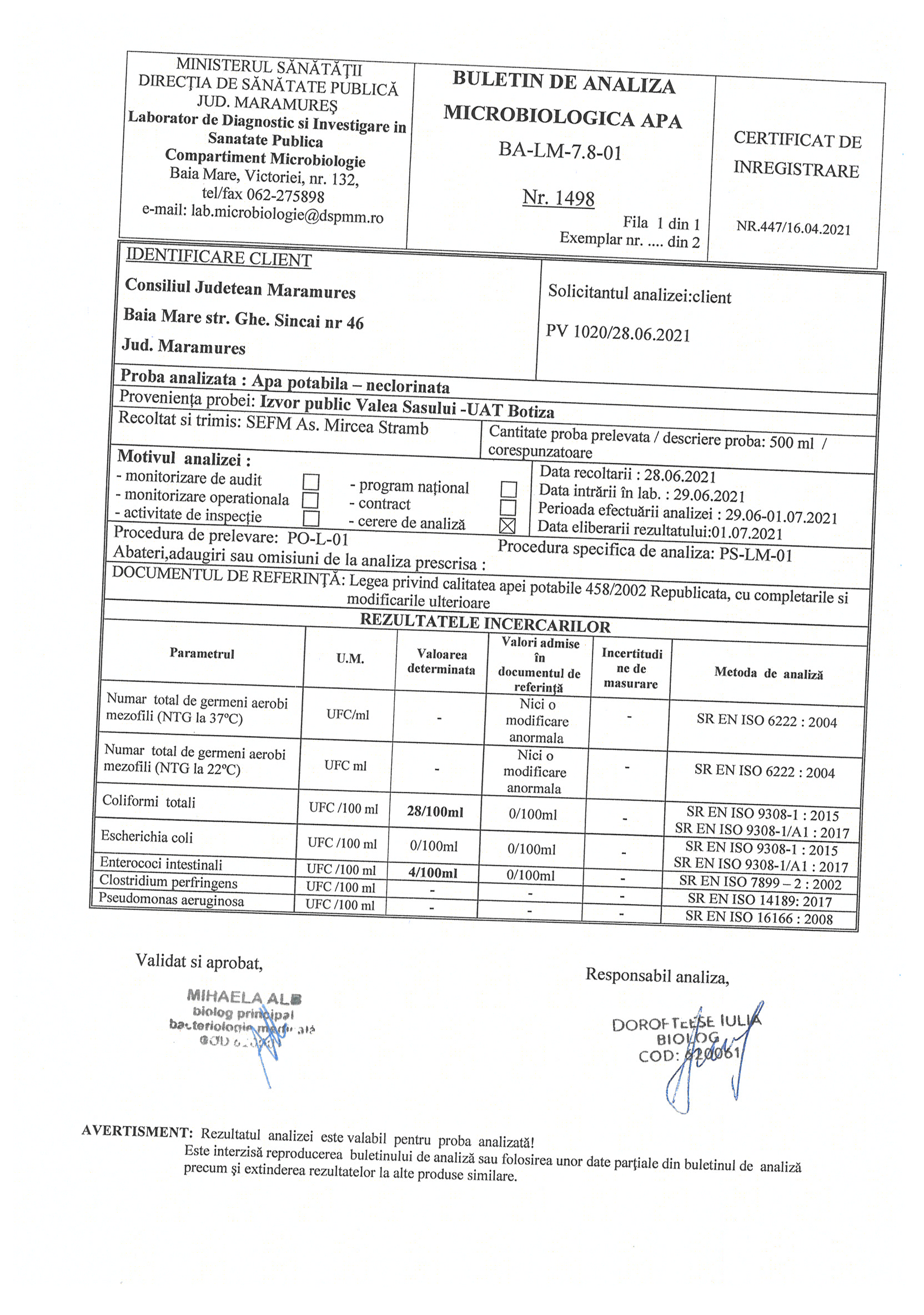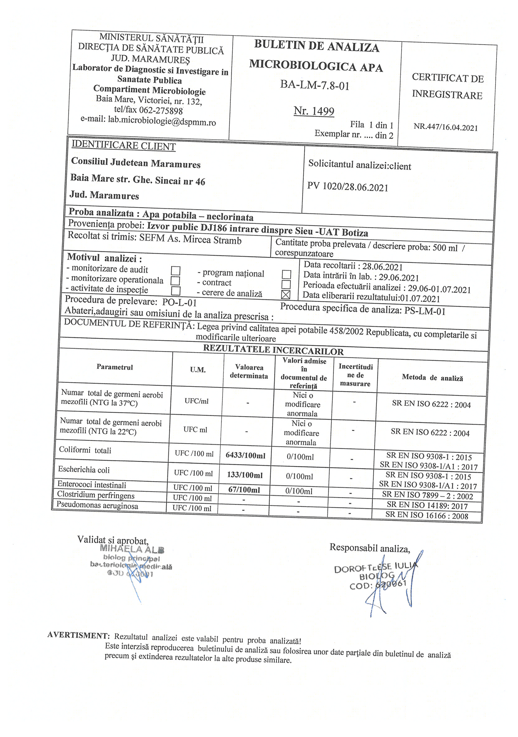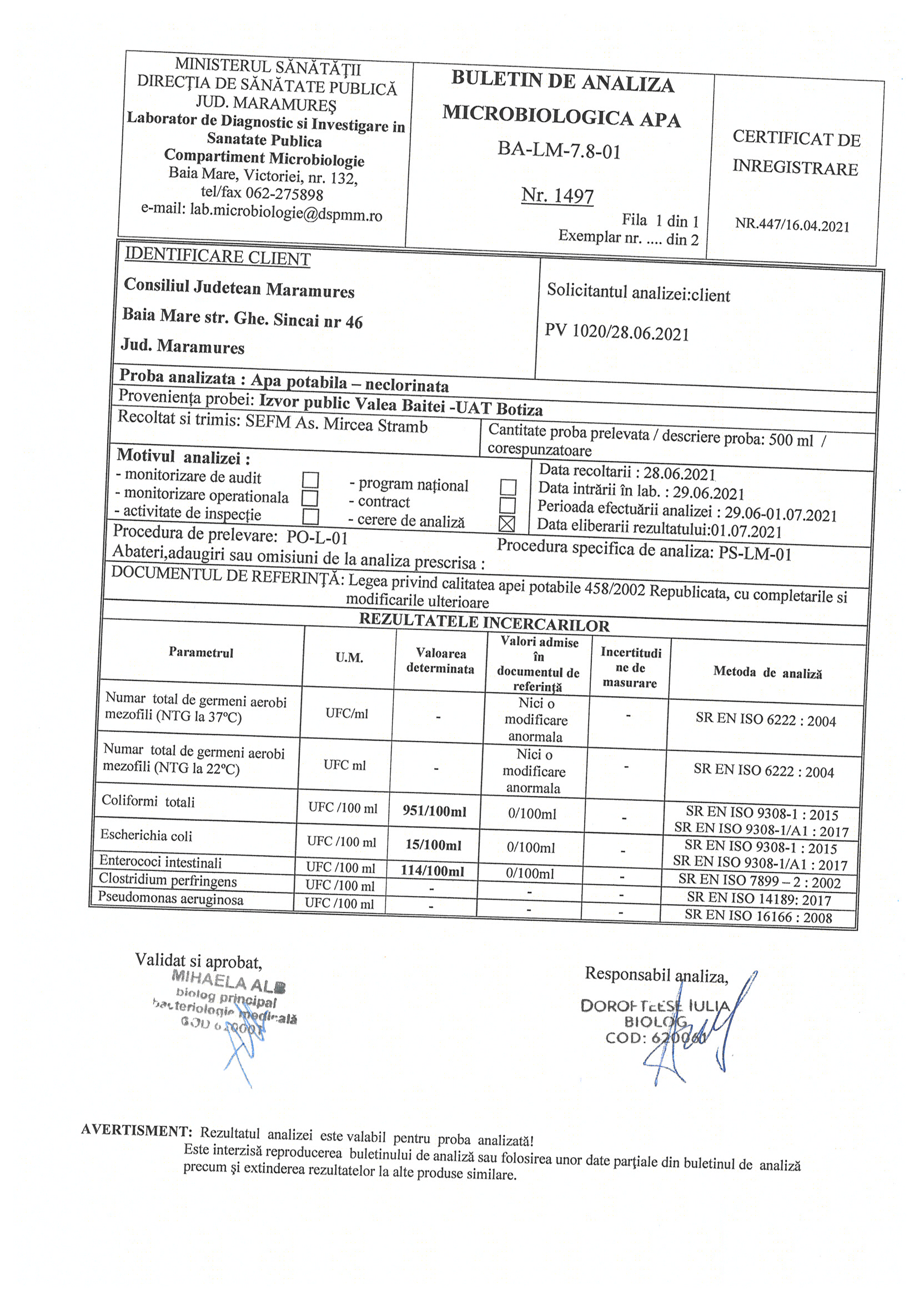 1 | Izvor Valea Băiței | Botiza | Se identifică cauzele de neconformitate, se remediază și se repetă analizele | ||