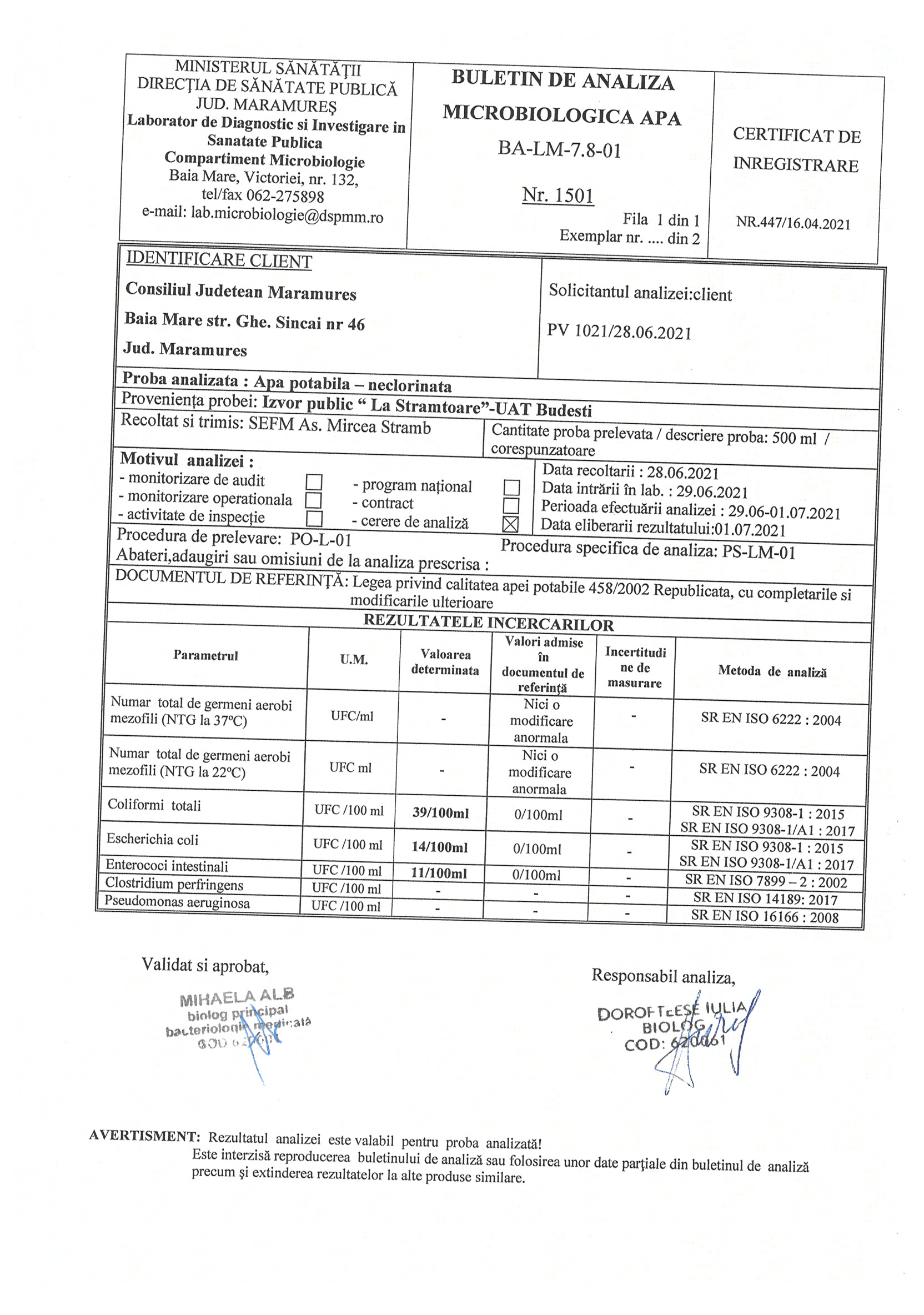 5 | Izvor La Strâmtura | Budești | Se identifică cauzele de neconformitate, se remediază și se repetă analizele | ||