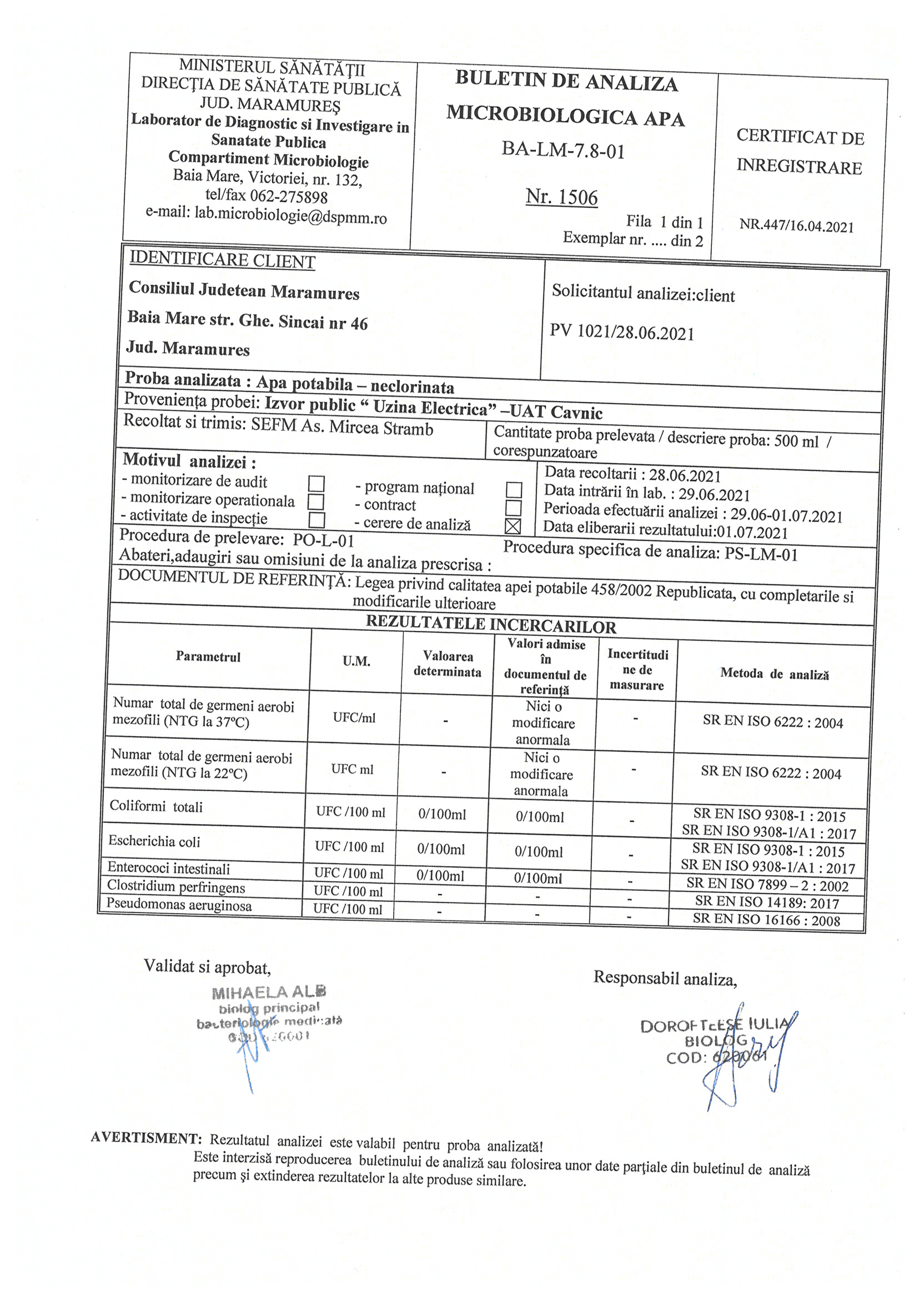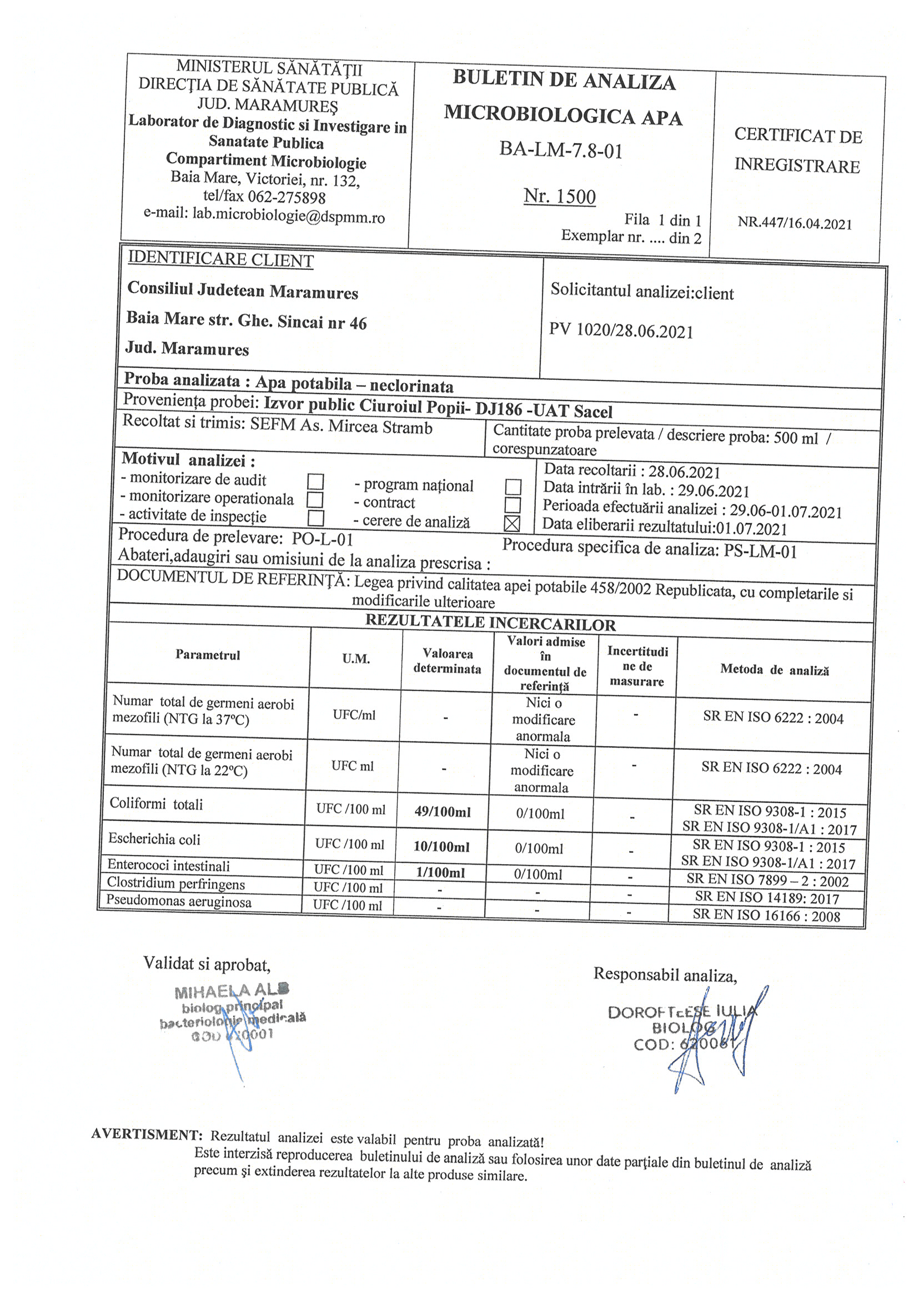 4 | Izvor Ciuroiul Popii | Săcel | Se identifică cauzele de neconformitate, se remediază și se repetă analizele | ||