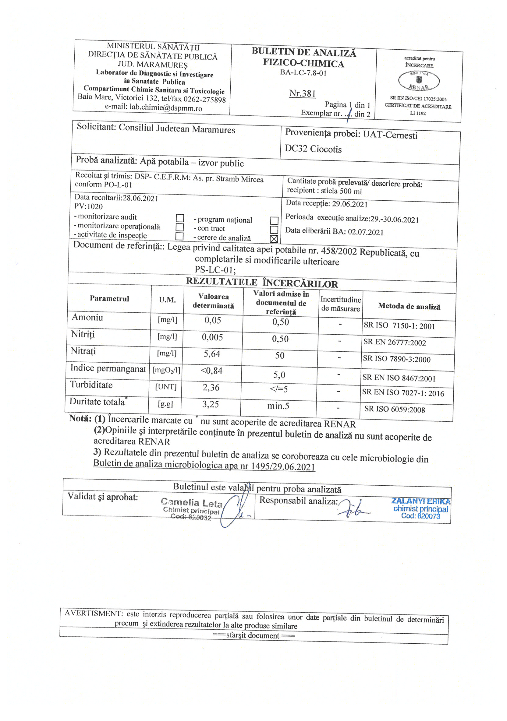 11 | Izvor DC 32 Ciocotiș | Cernești | Se identifică cauzele de neconformitate, se remediază și se repetă analizele | ||