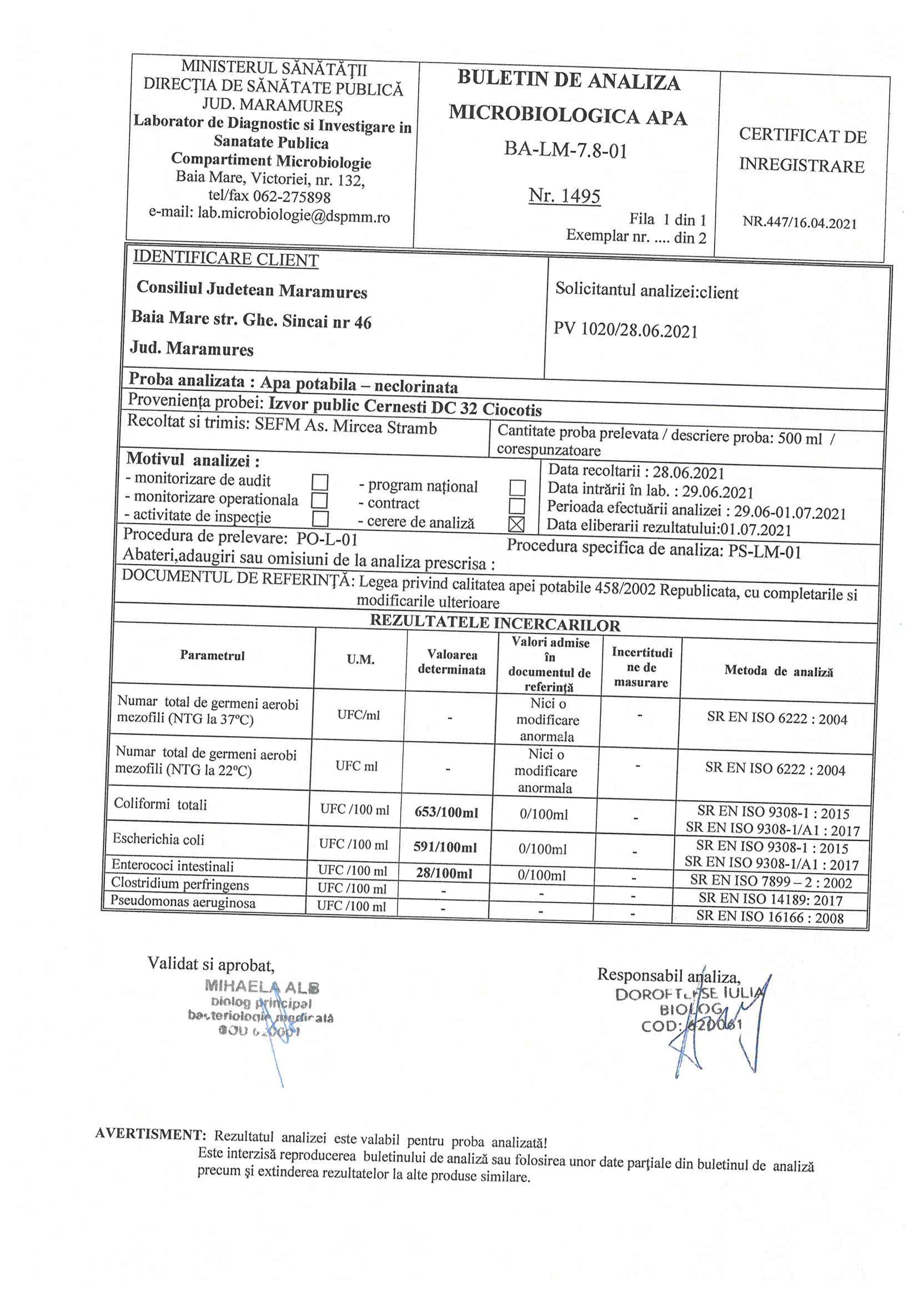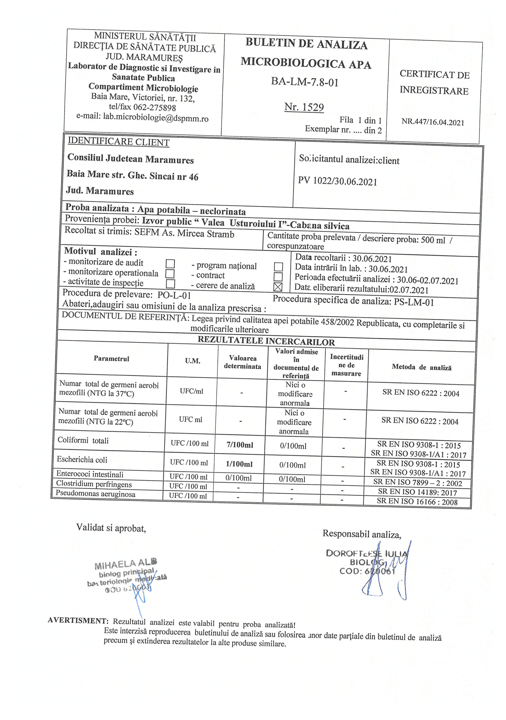 26 | Izvorul Ciorgău | Fărcașa | Se identifică cauzele de neconformitate, se remediază și se repetă analizele | ||