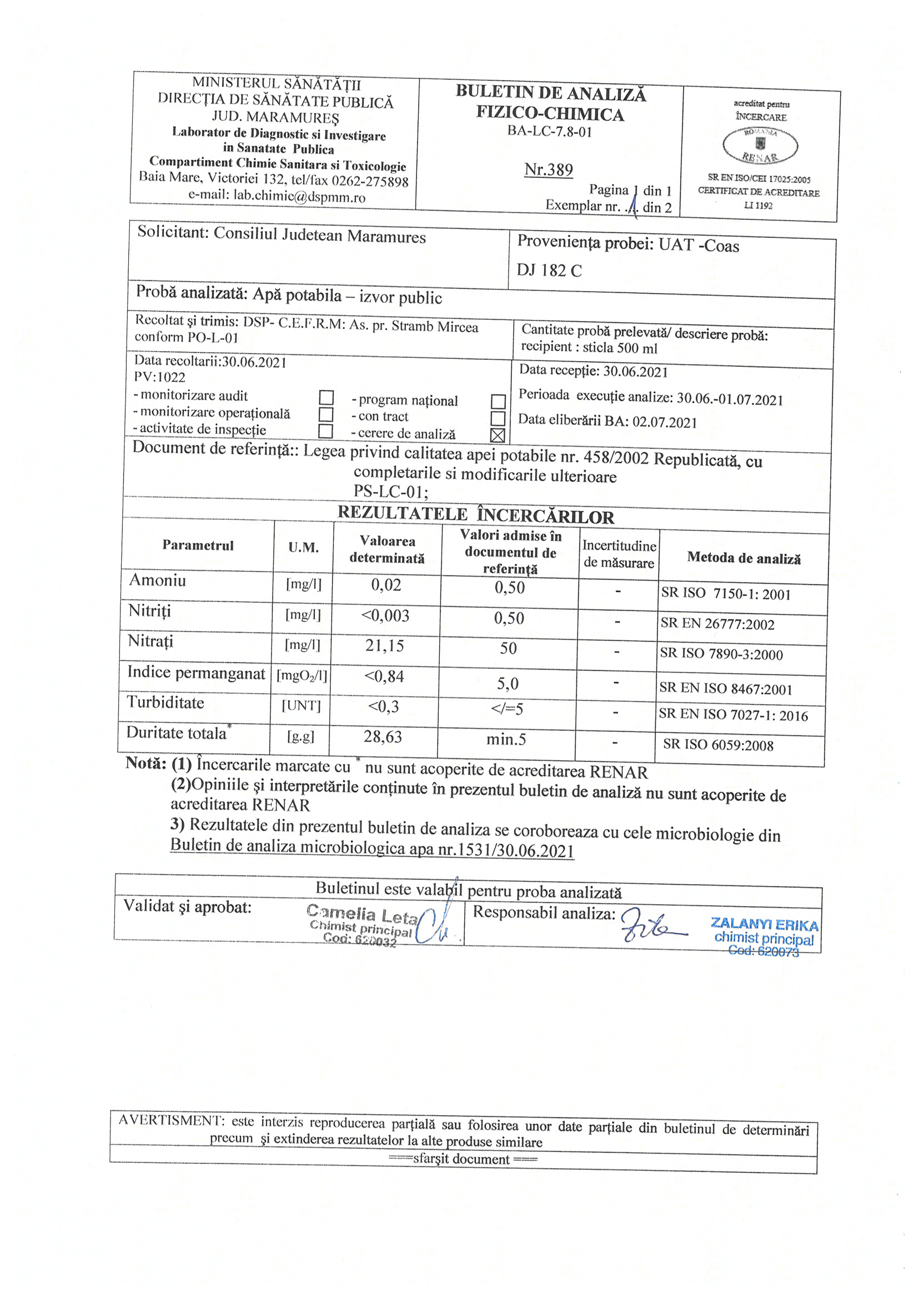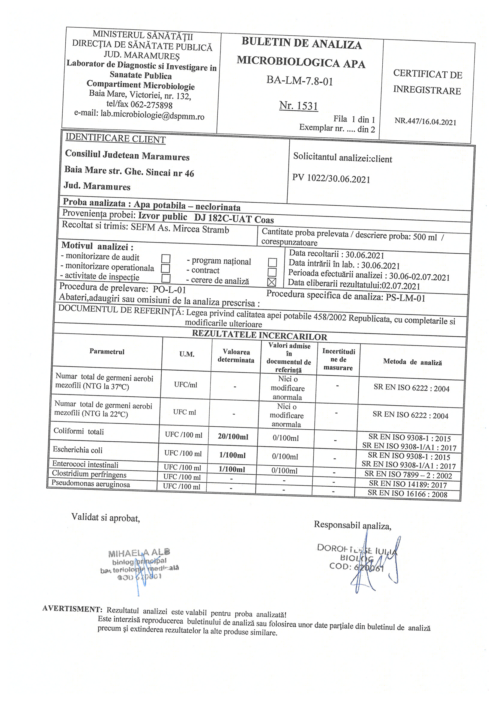 16 | Izvor DJ 182C | Coaș | Se identifică cauzele de neconformitate, se remediază și se repetă analizele | ||
