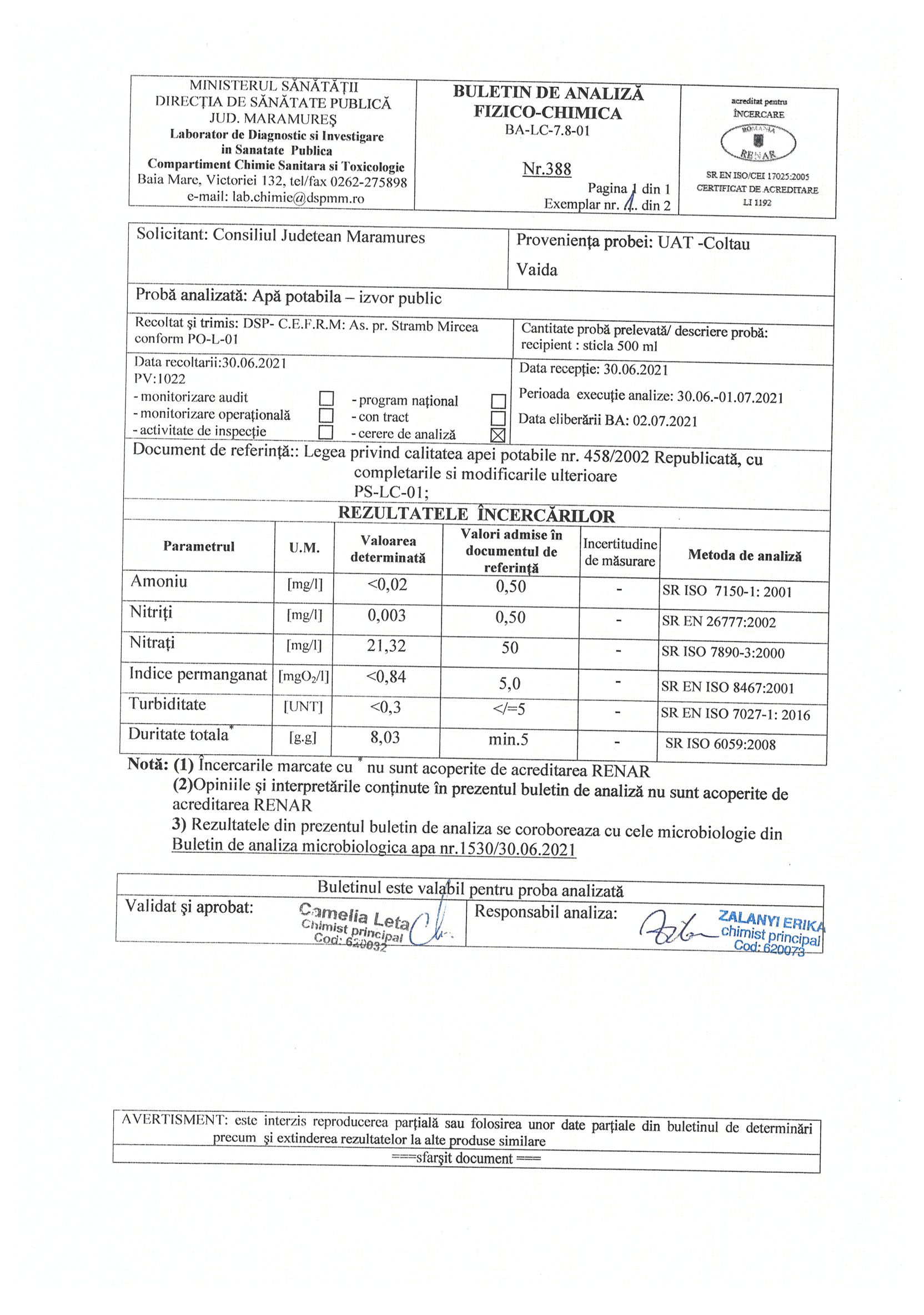 15 | Izvor Vajda | Coltău | Se identifică cauzele de neconformitate, se remediază și se repetă analizele | ||