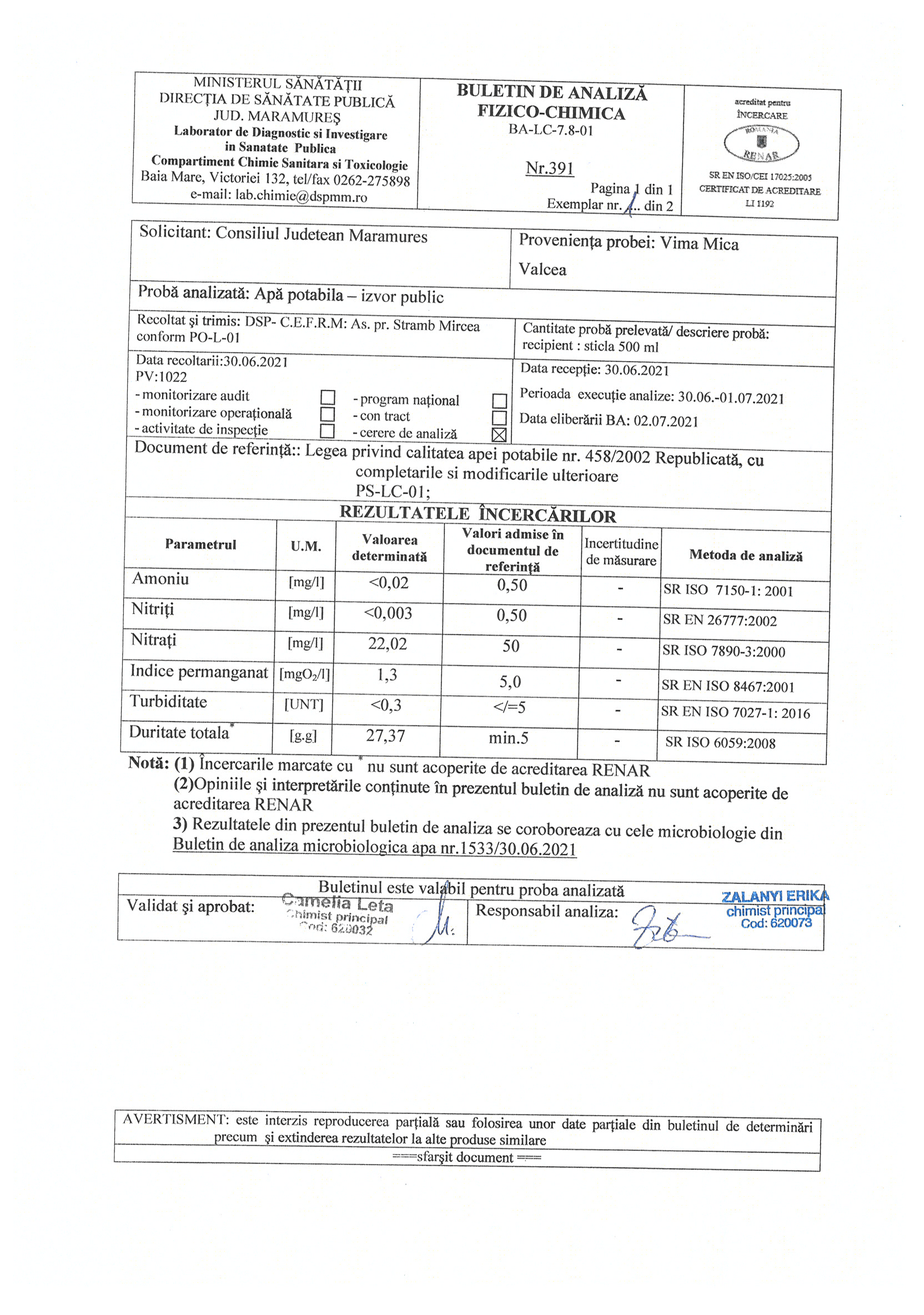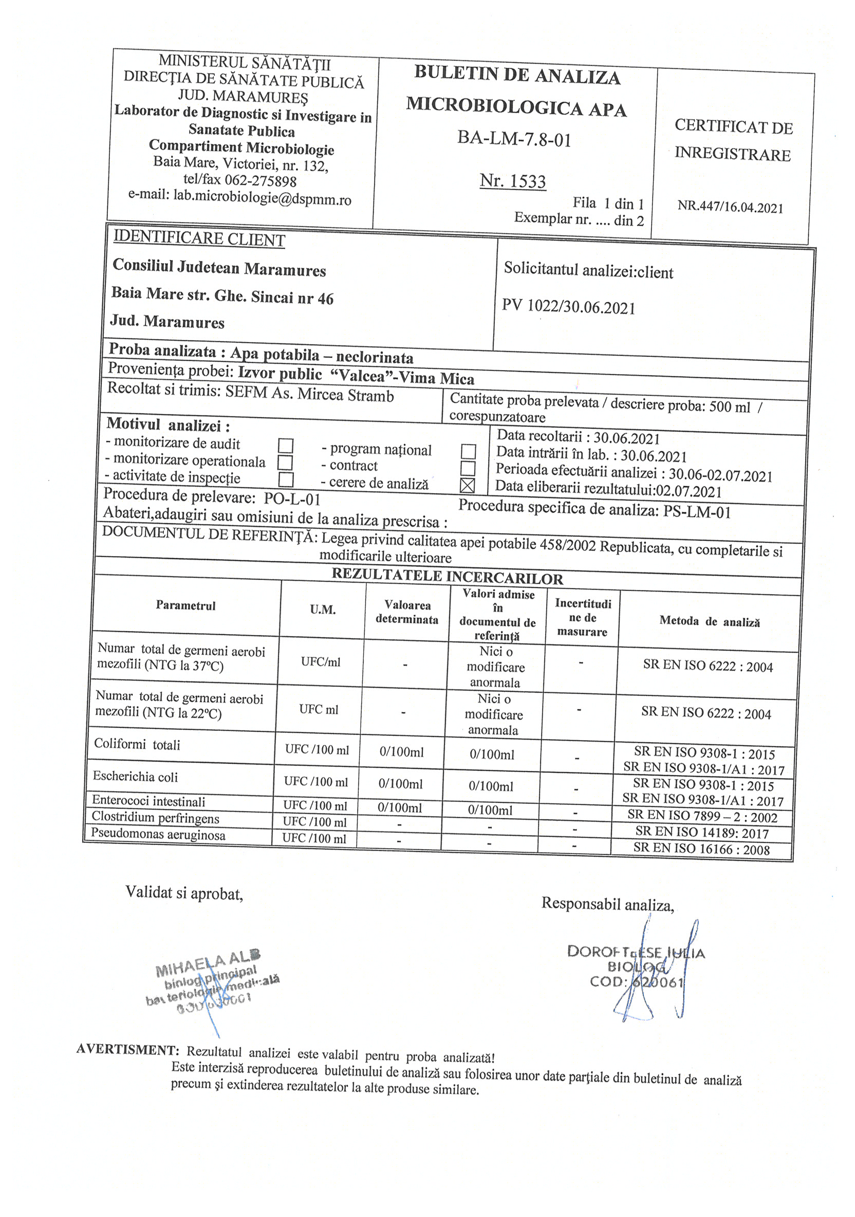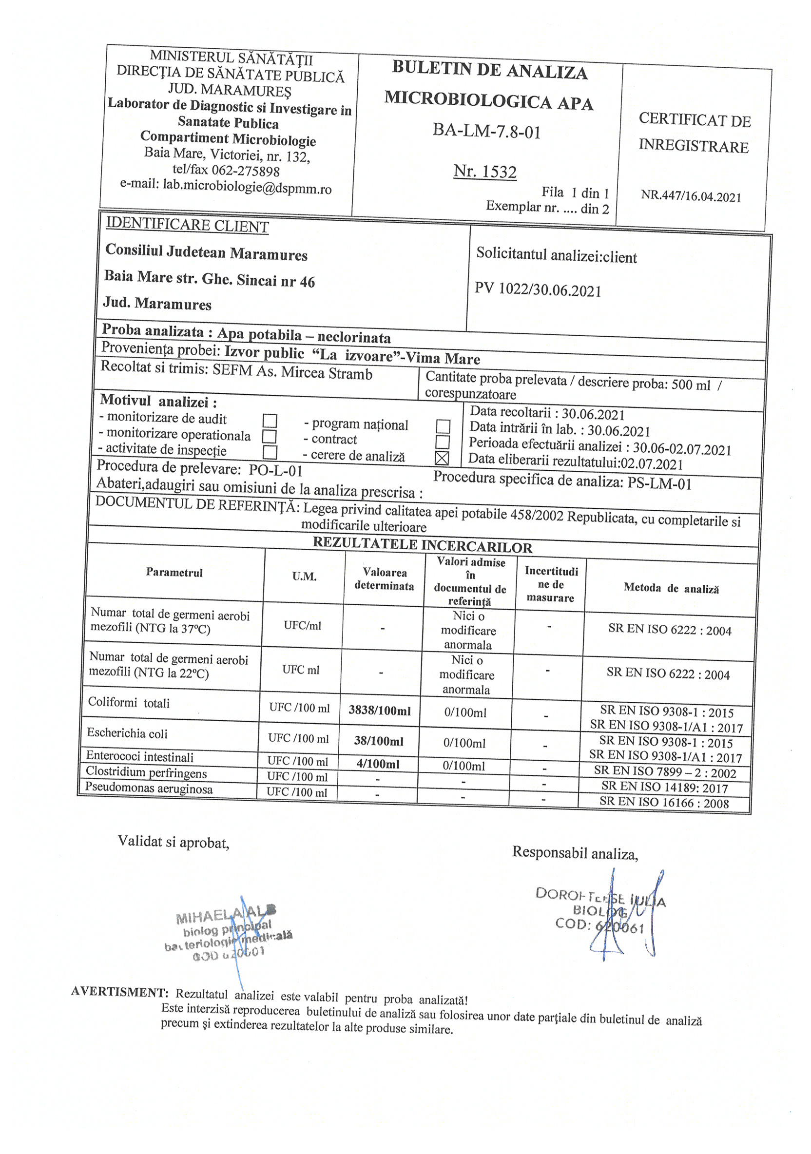 17 | Izvor La Izvoare în Vima Mare | Vima Mare | Se identifică cauzele de neconformitate, se remediază și se repetă analizele | ||